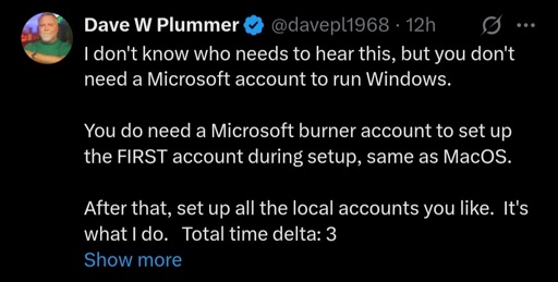 minus-squareFtumch@lemmy.dbzer0.comlinkfedilinkEnglisharrow-up3·28 days agoI installed Windows 11 Pro 24H2 yesterday and the oobe\bypassnro trick worked for me. You just have to make sure no ethernet cable is connected. Then if you tell the installer you have no internet, it’ll let you create a local account.