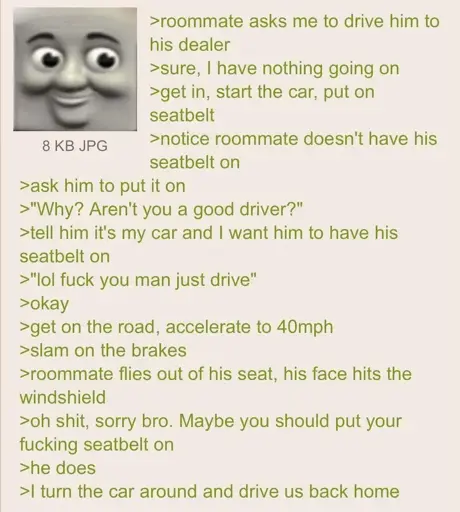 rumschlumpel@feddit.org to Greentext@sh.itjust.worksEnglish · 2 months agoWear your seatbeltlemmy.dbzer0.comimagemessage-square94linkfedilinkarrow-up11arrow-down10