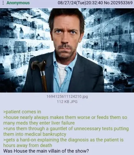 I’ve never seen an episode of house, but based on secondhand accounts, this is how I imagine an episode going: