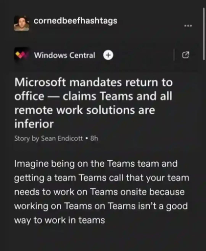 minus-squarefruitycoder@sh.itjust.workslinkfedilinkarrow-up1·1 month agoAs a full remote supporter i also agree Teams is insufficient (just use anything else!).