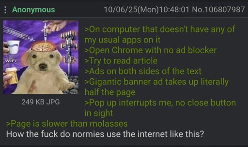 🍹Early to RISA 🧉@sh.itjust.worksM to Greentext@sh.itjust.works · 16 days agoAnon uses the internet like a normiesh.itjust.worksimagemessage-square105linkfedilinkarrow-up11arrow-down10