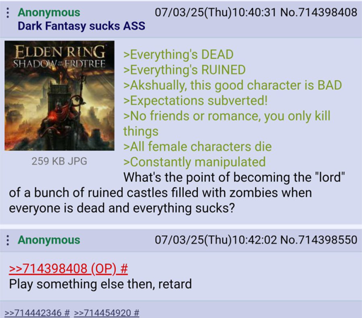 🍹Early to RISA 🧉@sh.itjust.worksM to Greentext@sh.itjust.works · 2 days agoAnon hates dark fantasysh.itjust.worksimagemessage-square42linkfedilinkarrow-up11arrow-down10