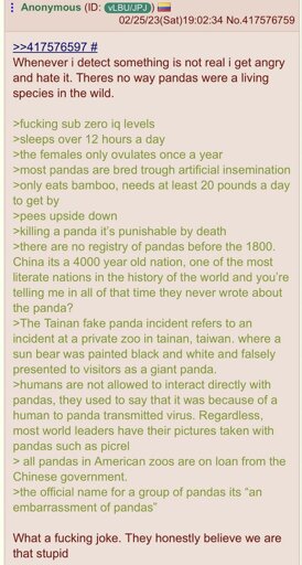 It’s greentext so the pandas are fake and gay, that’s why they need to be artificially inseminated.