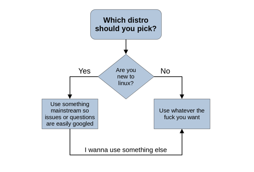So I personally try to keep closest to upstream regardless experienced or less experienced users => Debian if you adore those DEB packages and management, Fedora if you love those RPM packages and management, indie ones for indie packages e.g. Alpine, Arch… If you still run into issues it’s usually you, not the distro because it’s already battle hardened. :) But no worries, then you’ll find a lot of help and the problem has usually already even been discussed and is googleable! It’s 2023, none of the huge distros are plain shit and annoying, that’s been ironed out like a decade ago. So just go with a (big) flow somewhere.
