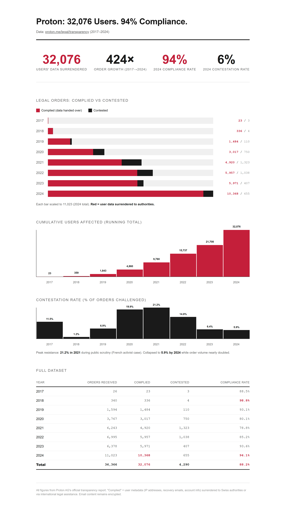 ☆ Yσɠƚԋσʂ ☆@lemmy.ml to Privacy@lemmy.mlEnglish · 1 month agoProton has handed over 32,076 users' data to governments since 2017. Their own transparency report states a 94% compliance rate in 2024.lemmy.mlimagemessage-square40linkfedilinkarrow-up1128arrow-down116