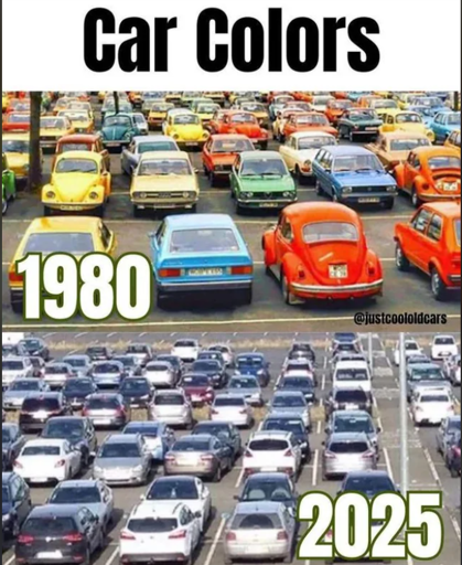 Not just the color. Each make and model used to look distinct and unique. Now they all have the same vague SUV shape. It makes sense aerodynamics and safety standards are a thing but it still feels so corporate and almost dystopian.