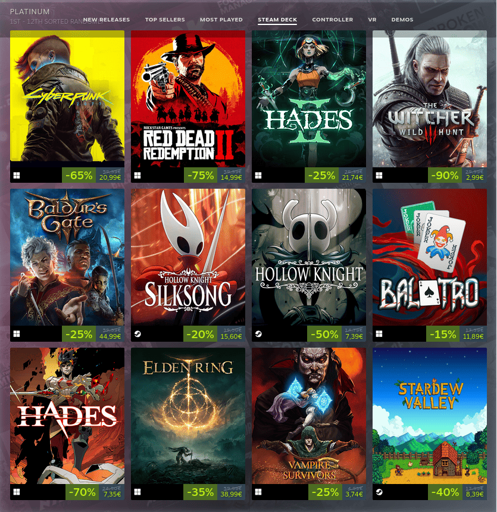mr_MADAFAKA@lemmy.ml to Steam Hardware@sopuli.xyz · 3 months agoMost Played Games on Steam Deck for 2025lemmy.mlimagemessage-square76linkfedilinkarrow-up1348arrow-down12file-text