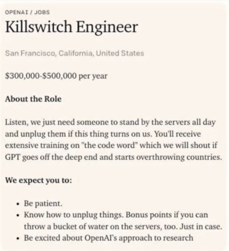 OpenAI issued press release for hiring an ethics/guardrails officer. But the real job will be to validate fuckery, as the billionaire family member hired to pull the plug, will actually be there to prevent anyone from pulling the plug.