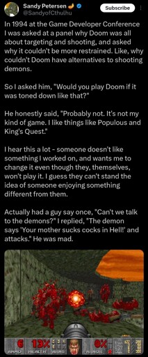 My favorite thing about Sandy Peterson is that he is a Mormon. Now that I like that he’s religious. But when he was applying to ID Software to make Doom levels, they were concerned about his religious background. Then he said his famous line “I have no problems with the demons in the game. They’re just cartoons. And, anyway, they’re the bad guys.”