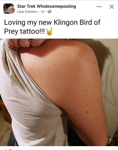 I can’t see it. Is it cloaked? Is it a tattoo of a cloaked Bird of Prey? Because that would be like you didn’t even get a tattoo, and that would be lame. That would be a lame joke of a tattoo.