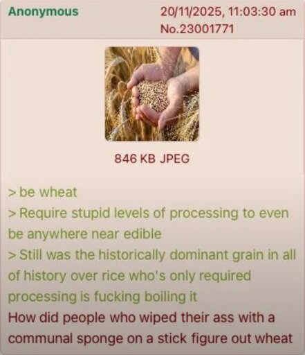 🍹Early to RISA 🧉@sh.itjust.worksM to Greentext@sh.itjust.works · 21 days agoAnon thinks about wheatsh.itjust.worksimagemessage-square182linkfedilinkarrow-up11arrow-down10