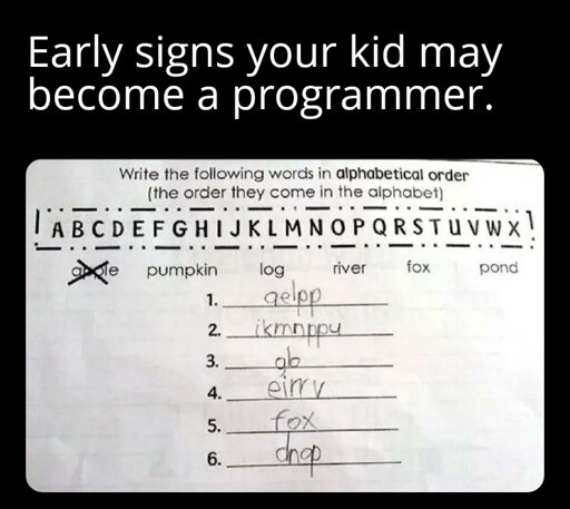 Honestly the question as asked is unambiguous: “write words in alphabetical order” cannot mean anything else than apple, fox, log, pond, pumpkin, river. If what was provided here were the expected answer, the wording should be “write each of the following words with its letters sorted by alphabetical order”.