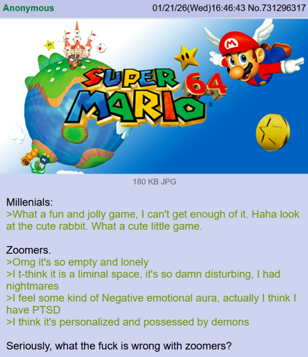 I don’t think OoT is as liminal because they put a lot of effort into adding atmosphere. There’s a lot of background animal noises and bugs flying around. It’s low tech, but the environments don’t feel empty in the same way as the polished and clean Mario 64 environments.