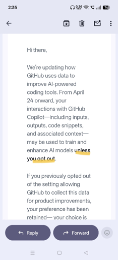 Got this email last night and felt validated for never uploading any code to GitHub because I don’t trust Microsoft. lol I don’t have any big coding projects, but I self-host a ForgeJo server in my mini rack at home behind a Twingate VPN.