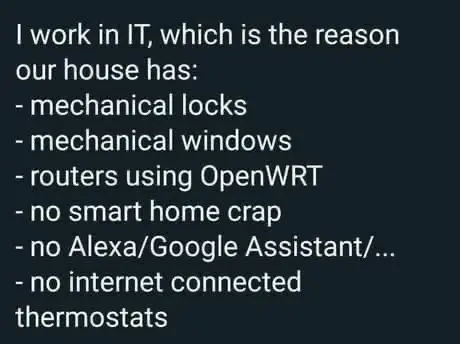 A rough translation would be “in the blacksmith’s house you’ll find wood spoons”. It’s not a new thing, it’s been like that since ancient times.Is that the same thing? The impression I get is that OPs post is about the IT worker actively distrusting smart tech. While I assume your example is more that the blacksmith doesn’t bother with making metal spoons for himself and using what ever he had already, which would be more comparable to a network engineer still using the ISPs shitty router.