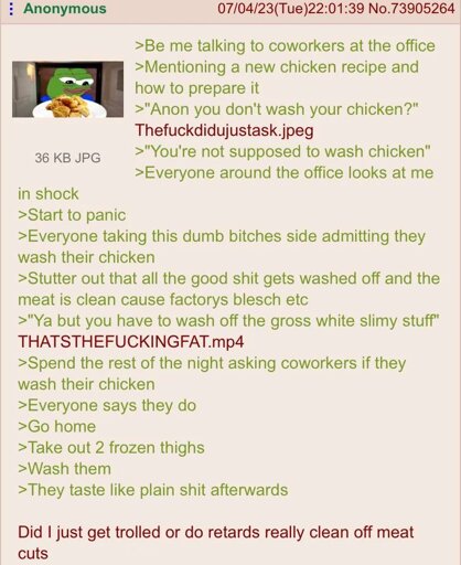 minus-squareMaeve@kbin.earthlinkfedilinkarrow-up0·1 year agoI used to not until prime people who worked at the processing plant informed me of what goes on. Wash it, it’s disgusting. Also clean off the gross white stuff and as much fat as you can. I leave the skin though. @