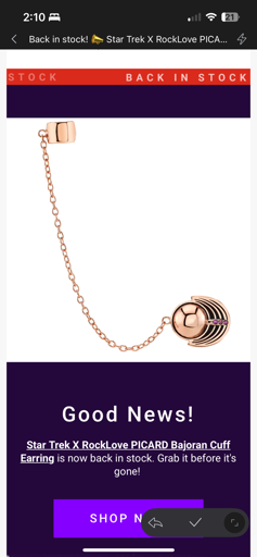 EDIT: If anyone was wondering if they had a Kira Nerys d’ja pagh, yes. It is currently in stock. I wear mine a lot. All my earrings are Star Trek related. https://www.rocklove.com/products/star-trek-x-rocklove-kira-nerys-bajoran-cuff-earring